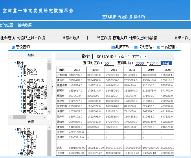 本平台收集了京津冀地区省、地级市、县级市、县/区、乡镇、街道等不同地域尺度的人口、社会、经济、资源能源、生态环境等全方位社会公开的基础数据和专题数据,并据此构建了不同类型城市、不同类型县域等的对标评估平台,对促进京津冀一体化发展研究提供有力的数据支撑。